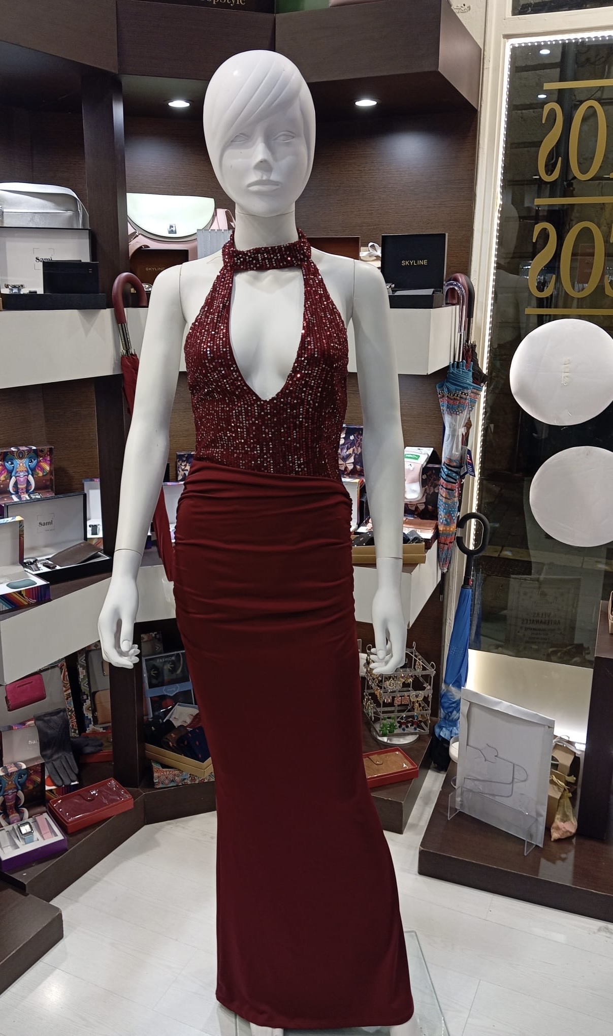 Vestido largo con cuerpo de lentejuelas  y cuello halter. Es talla única válida desde talla 34 a talla 40.