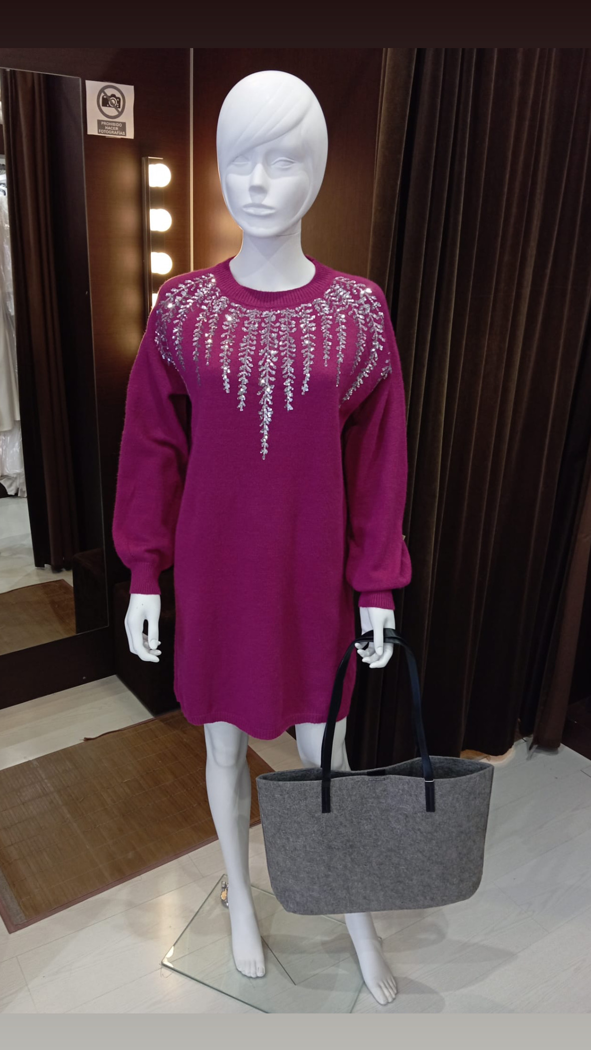 Vestido de ounto en color único buganvilla con detalles plateados.
